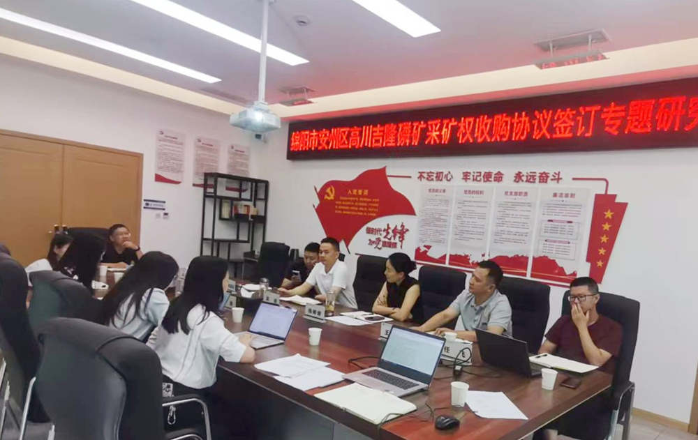 6月10日,公司召開綿陽(yáng)市安州區(qū)高川吉隆磷礦采礦權(quán)收購(gòu)協(xié)議專題研究會(huì)。公司支部書記、董事長(zhǎng)袁波出席會(huì)議并講話,支部委員、總經(jīng)理?xiàng)铈面弥鞒謺?huì)議。(素材來(lái)源:業(yè)務(wù)部 楊東平)
